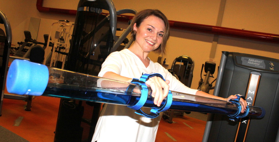 Röhre ist blau eingefärbt. Das Wasser im Inneren der Röhre muss ständig ausgeglichen werden, sodass zahlreiche Muskelpartien im Körper gefordert sind. Durch das Eigengewicht von 3,5 kg wird der