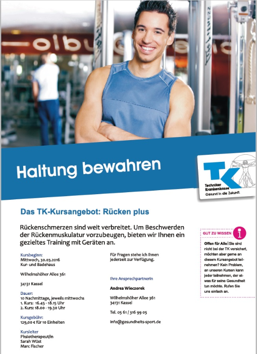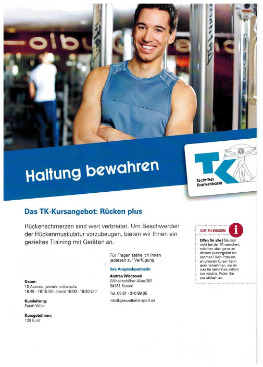 News vom 05.07.16: Zwei neue TK-Kurse Rücken plus starten am 7. September! Immer mittwochs, 16:45 bis 18:15 Uhr und 18:00 bis 19:30 Uhr. Schnell anmelden über unser Kontaktformular.